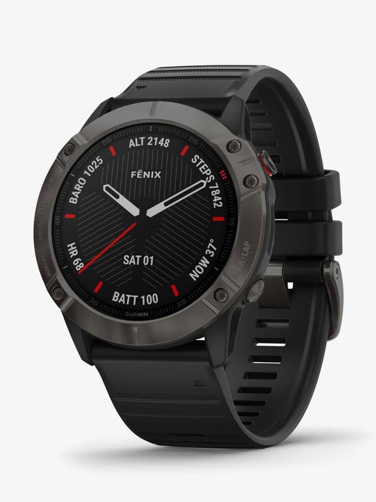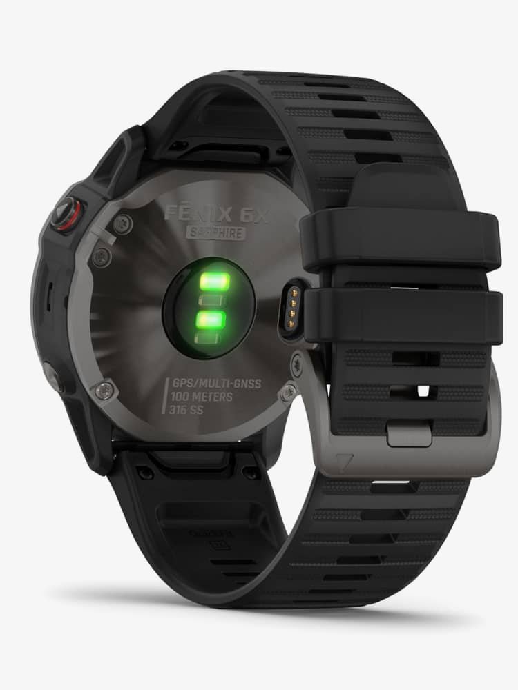With a big, sunlight-readable 1.4'' display that's 36% larger than previous Fenix models, the Garmin Fenix 6X Sapphire multisport GPS watches add mapping, music and more to your workouts. They offer training status, running/cycling dynamics and environmentally adjusted VO2 max estimates. Both models feature a first-of-its-kind PacePro feature that helps keep your pacing strategy on track, providing grade-adjusted guidance as you run a course. Styled for all-day wearability, these versatile watches come with preloaded TOPO maps and ski maps for more than 2,000 worldwide ski resorts. Other highlights include enhanced wrist heart rate, smart notifications, Pulse Ox sensing, Garmin Pay contactless payments and more. Customisable power manager modes let you see and control how various settings and sensors impact battery life. Sapphire editions add the quality and durability of a scratch-resistant sapphire lens and other premium materials. • Powered by the quartz movement. • Presented on a black rubber strap with traditional buckle. • Scratch resistant sapphire crystal glass. • 51.0mm case width. • 100 metre water resistance.