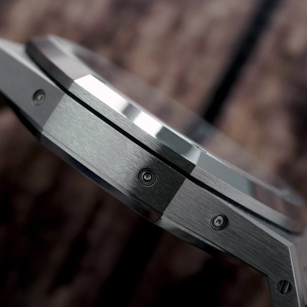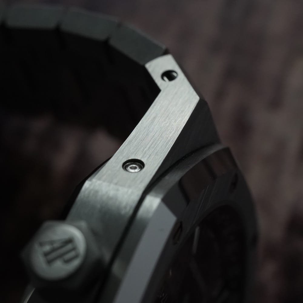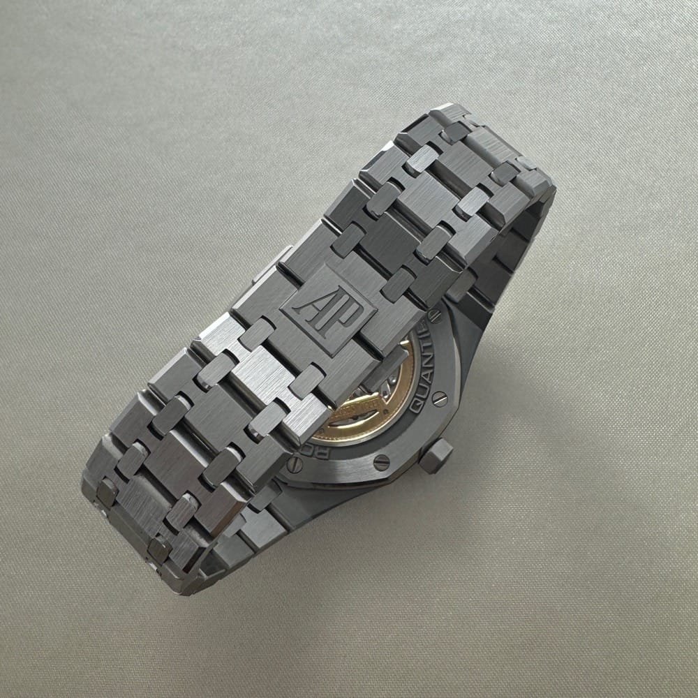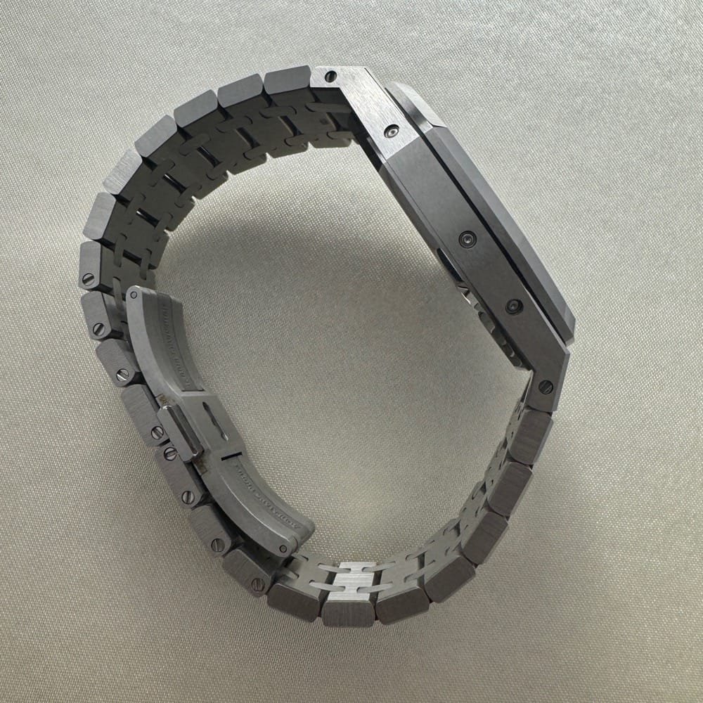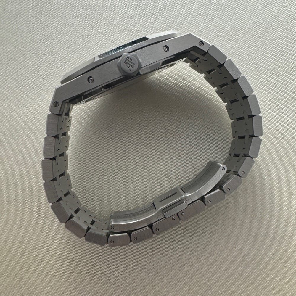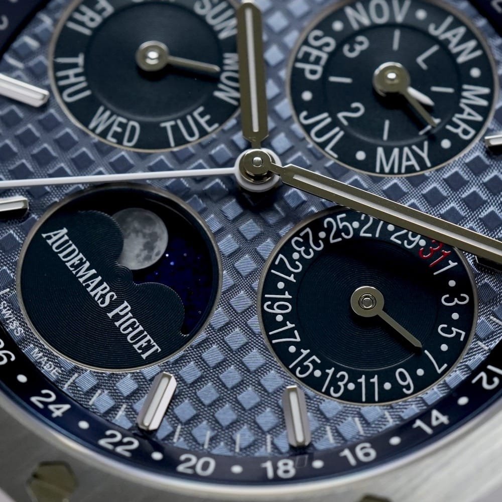The 41mm case, with a slim profile of just 9.5mm, was constructed with the sharp lines and brushed surfaces characteristic of the Royal Oak collection. The octagonal bezel, secured by eight visible screws, and the integrated stainless steel bracelet with a folding clasp were retained, ensuring the watch’s instantly recognizable aesthetic. The Grande Tapisserie dial featured a new gradient of blue tones, with the subdials and inner bezel rendered in the darker, iconic shade, while the rest of the dial displayed a lighter blue for added contrast and depth.