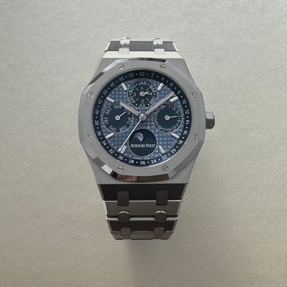 The Audemars Piguet Royal Oak Perpetual Calendar 26574ST.OO.1220ST.03 was introduced as a modern interpretation of the brand’s iconic perpetual calendar complication, housed within the legendary Royal Oak design. This timepiece, crafted in stainless steel, was designed to showcase the brand’s horological expertise while paying homage to the original Royal Oak’s signature blue hue, referred to as “Night Blue, Cloud 50” in the archives.