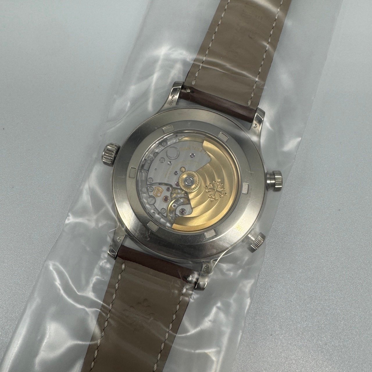 The timepiece is completed with a rich brown calfskin strap that develops a beautiful patina over time, secured by a white gold fold-over clasp for added security and comfort. Being factory single sealed, this 5524G-001 represents the ultimate opportunity to own a piece of Patek Philippe’s legacy in its most pristine condition, complete with all original documentation and packaging.
