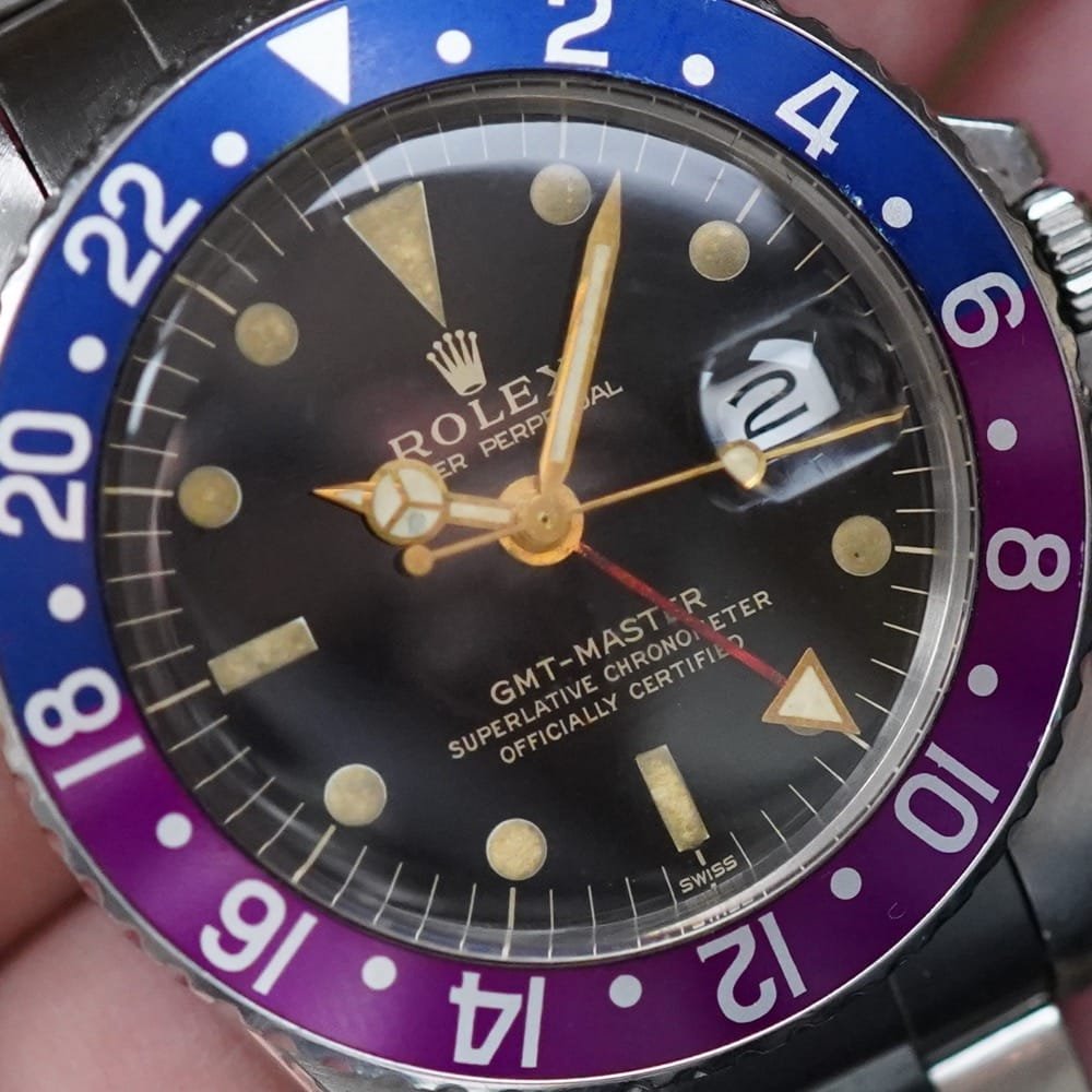 The Rolex GMT-Master Pepsi 1675 is a timeless vintage treasure that has become even more unique with age. Introduced in late 1950s, this classic watch is renowned for its red and blue “Pepsi” bezel, originally designed to help pilots easily distinguish between day and night hours while tracking multiple time zones. Over the years, however, the bezel has developed a distinct patina that transforms its colors—fading the red into rich, deeper shades, and giving the red a purplish hue. This unique transformation occurs as the pigments age and react to environmental factors, creating a one-of-a-kind color profile on each 1675.
